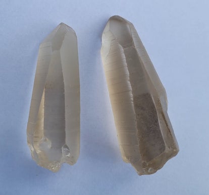 Ruwe lichte rookkwarts kristalle, in Laserkwarts vorm met zijstreepjes. Zg. Lemurians.