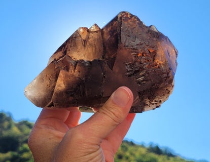 Ruw stuk donker Rookkwarts uit Bahia, met de typische driehoekjes opbouw, ok wel Beta quartz genoemd.