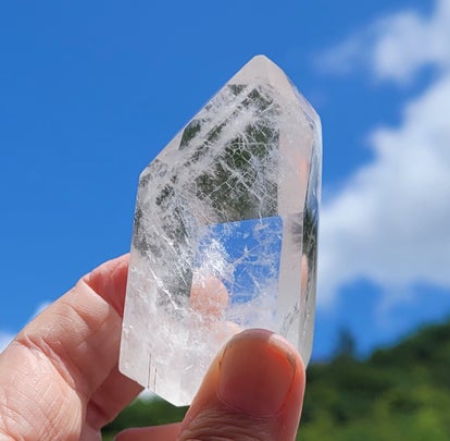 Mooie punt geslepen Bergkristal met letterlijk schitterend fantoom.
