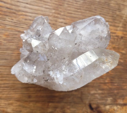 Plat cluster Bergkristal uit Brazilië, veel liggende heldere punten. Ook paar afgebroken.