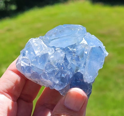 Prachtig intens blauw stuk ruwe Celestien met heldere kristallen.