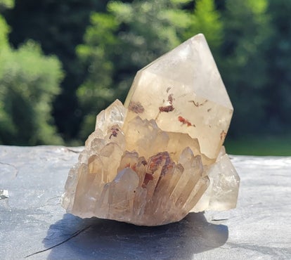 Mooi Citrien kristal met kleintjes rondom, zg. Kundalini Citrien uit Congo. Lichtgeel met rode hematiet flakes er in.