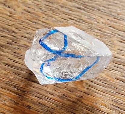 Diamond Quartz van Pakistan. Met kleine bewegende bubbel. Enhydro. Dubbeleinder, Herkimer of Pakimer ggenoemd. Het blauwe kan eraf gewassen. Rode is mijn rondje op foto.