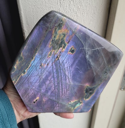 Sculpture Purple Labradorite, Mermaid Labradorite, colors ate deep in it, but still visible.