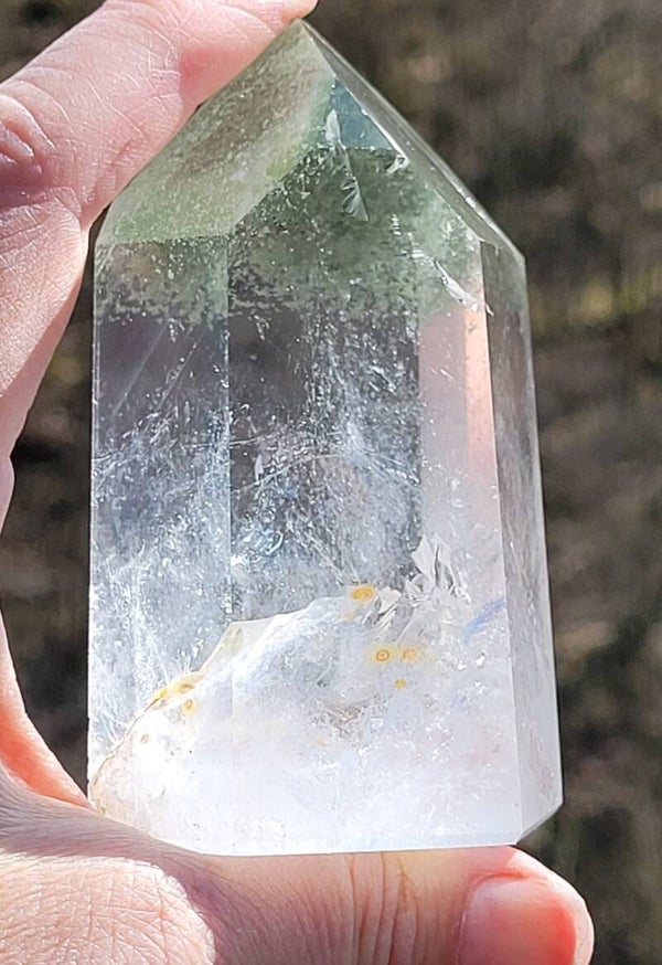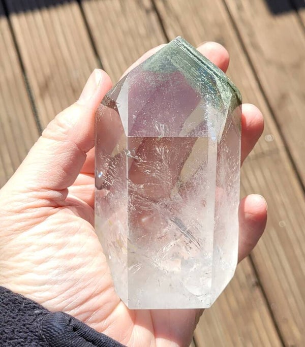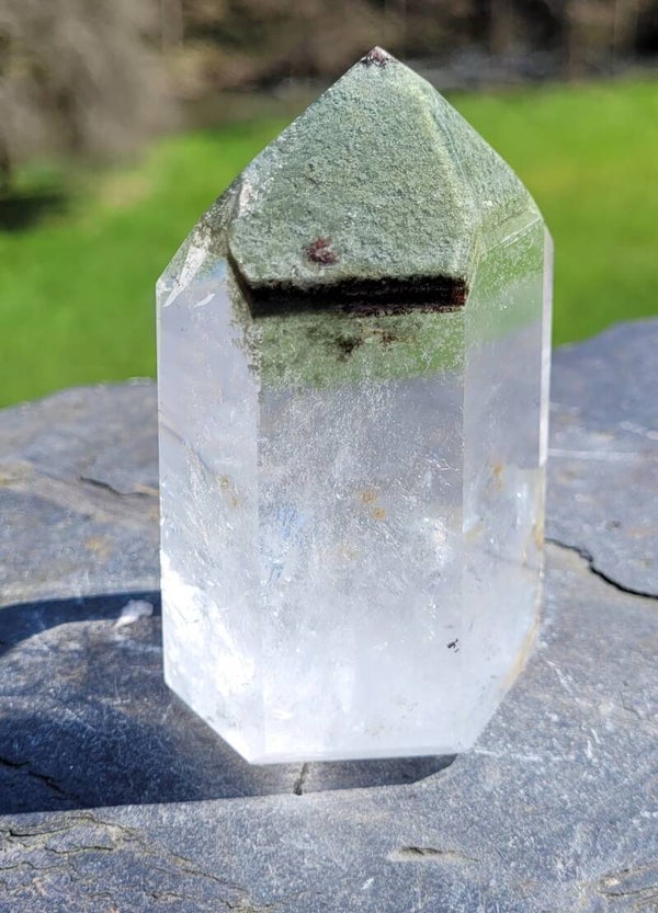 Prachtige heldere geslepen toren Bergkristal met Lodoliet, Chloriet fantomen. Kleine streepjes onder elkaar in groen en beetje rood.