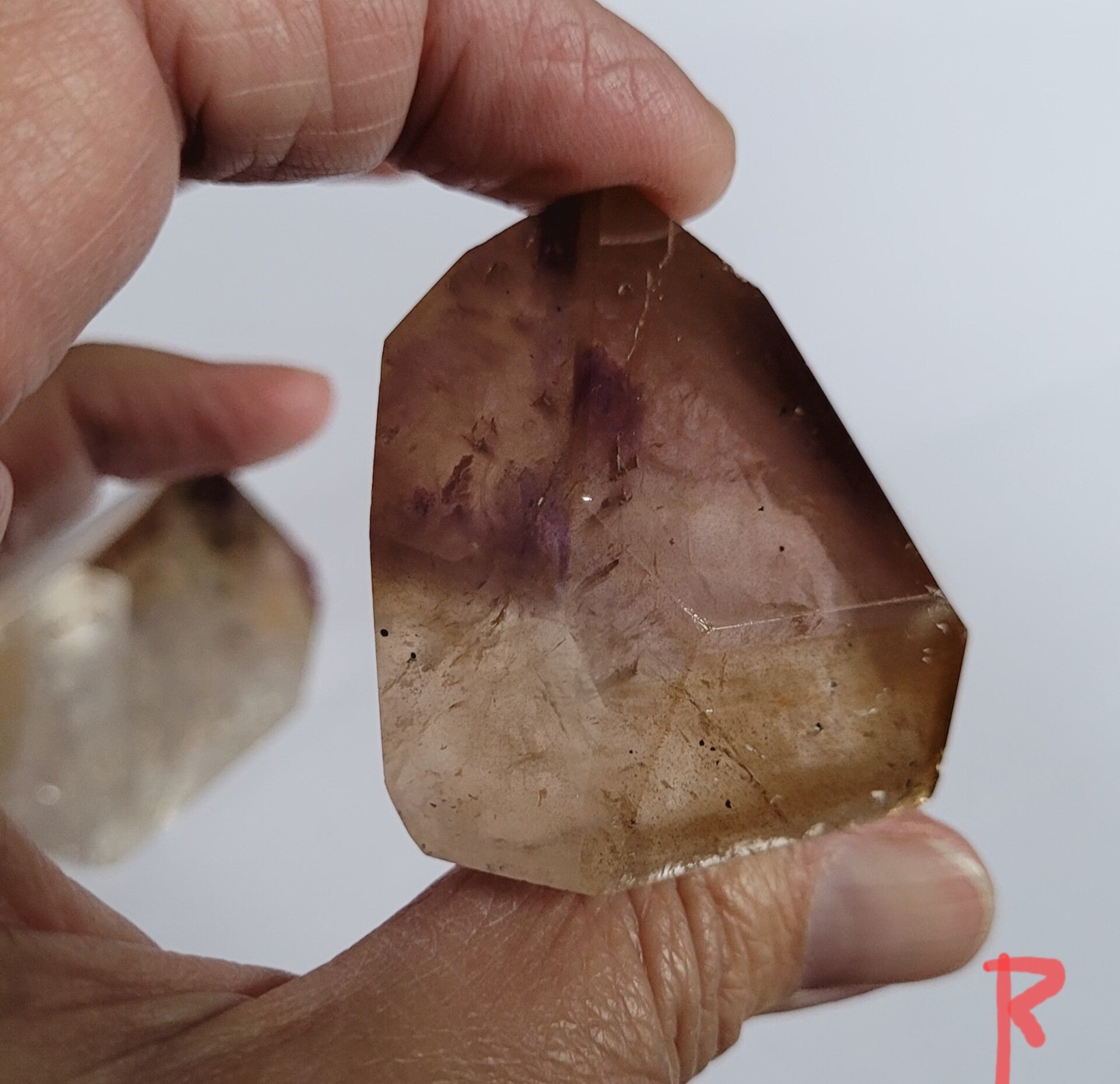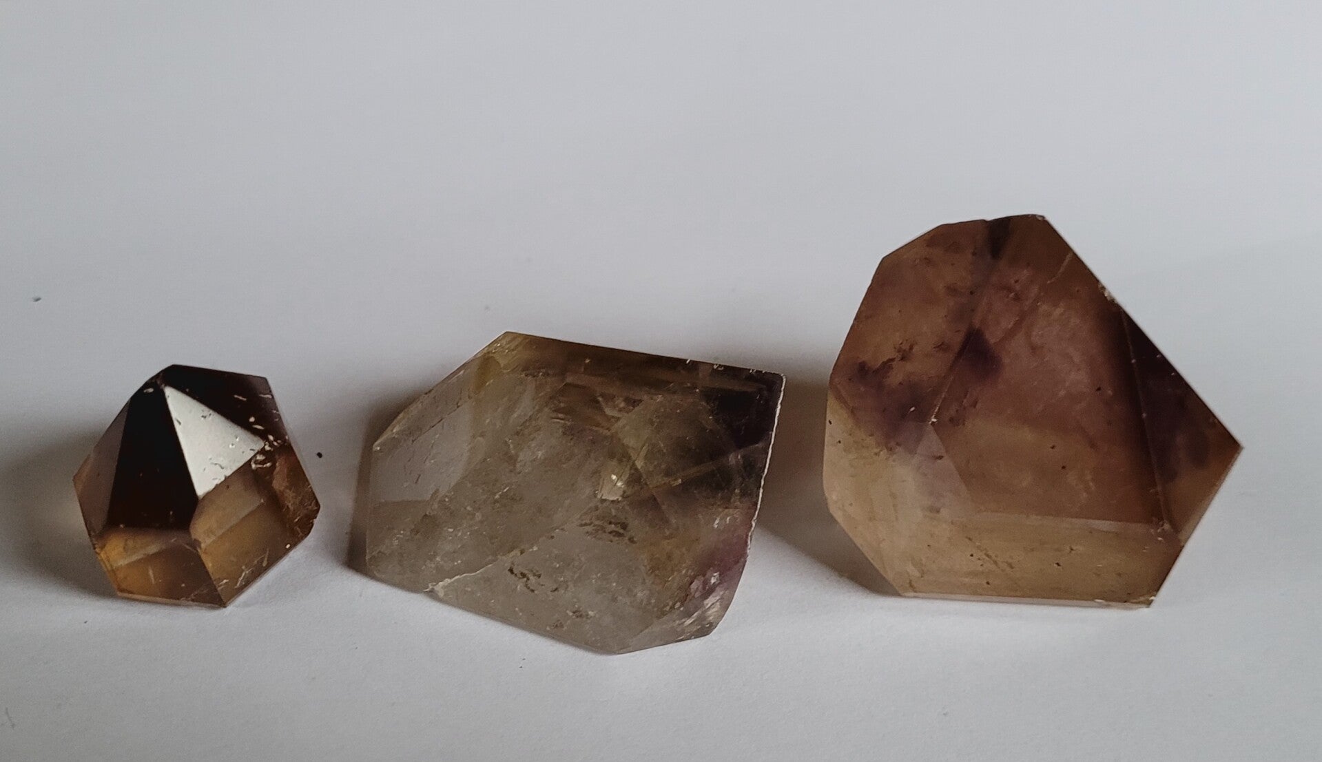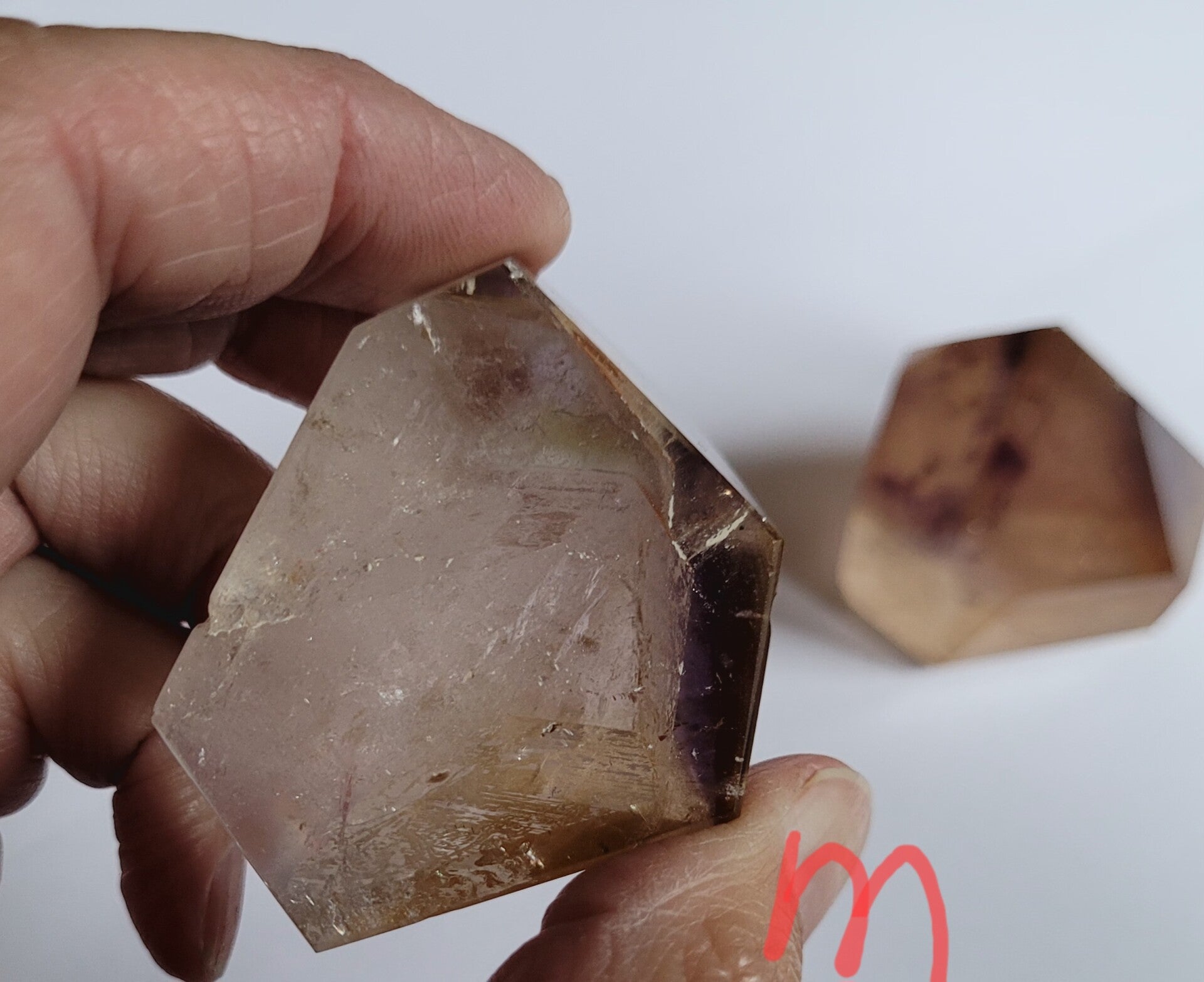 Aangeslepen punten Amethist met hematiet of limoniet. Ijzermineralen.