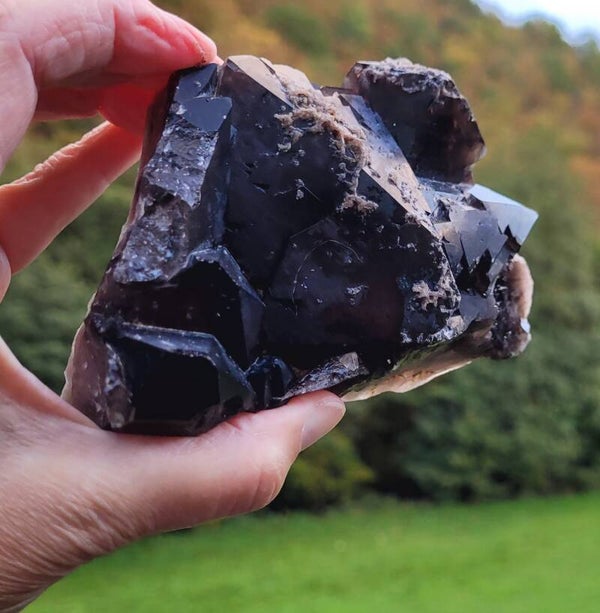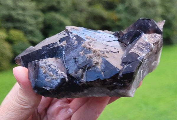 Ruw stuk donker Rookkwarts uit Bahia, met de typische driehoekjes opbouw, ok wel Beta quartz genoemd.