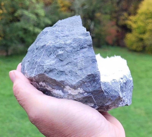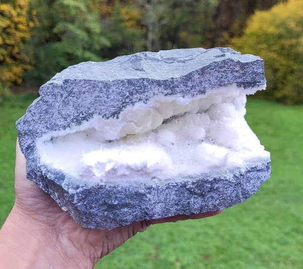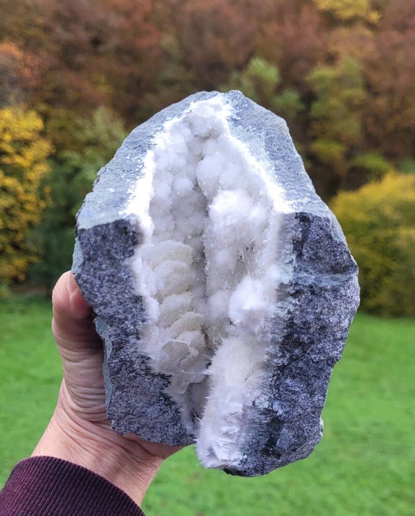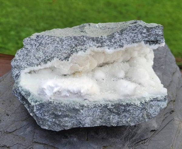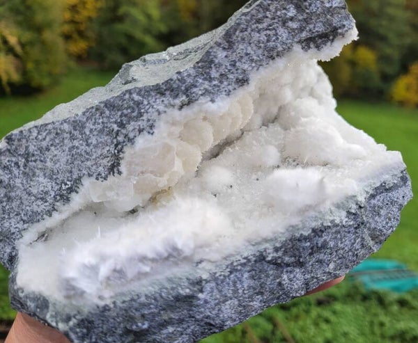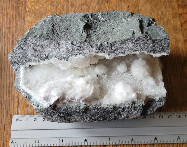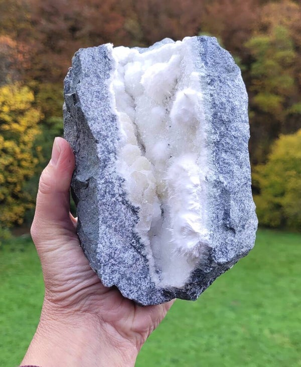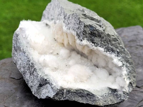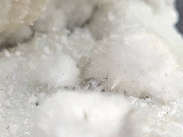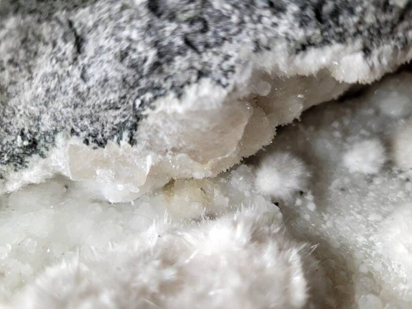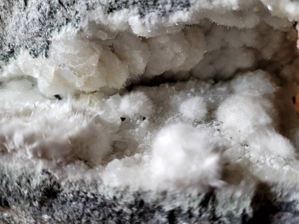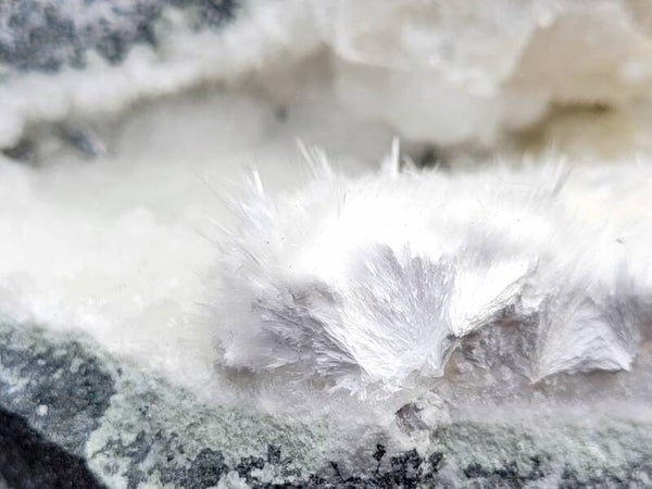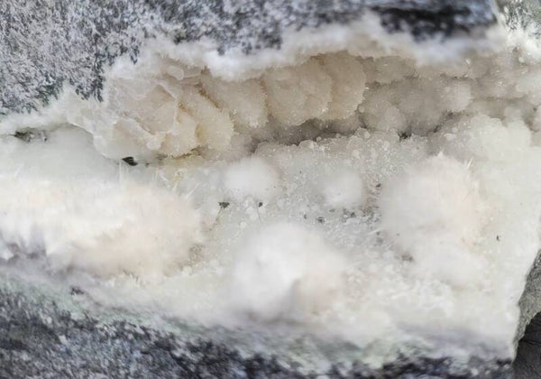 Deel van prachtig spierwitte geode Okeniet uit India. Met paar Caciet kristallen.