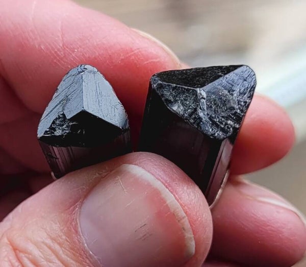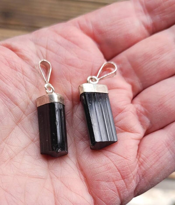 Mooie dikke zwarte toermalijn kristallen met eindkap. In zilver cap hanger.