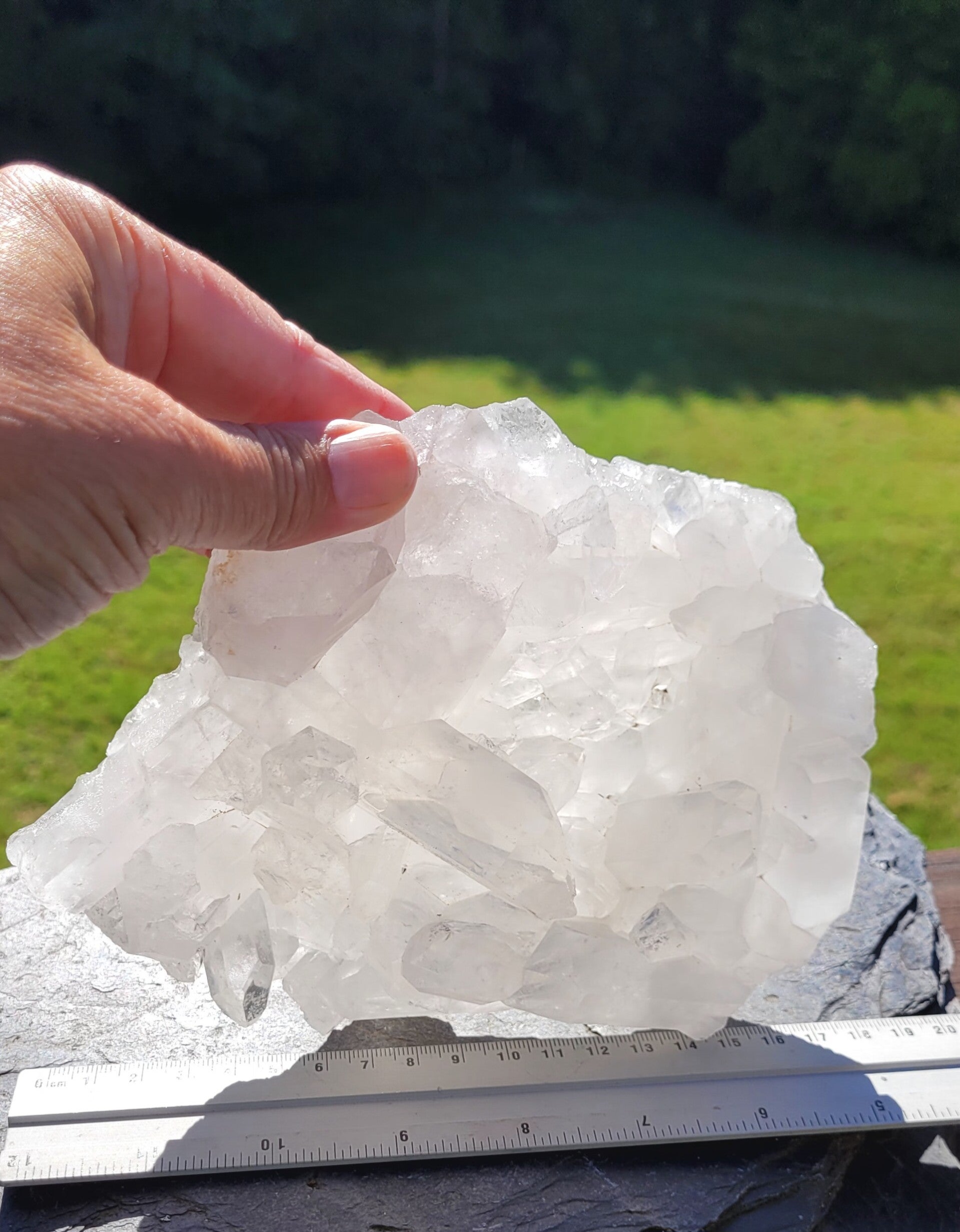 Plat cluster Bergkristal uit Brazilië, veel liggende heldere punten. Ook paar afgebroken.