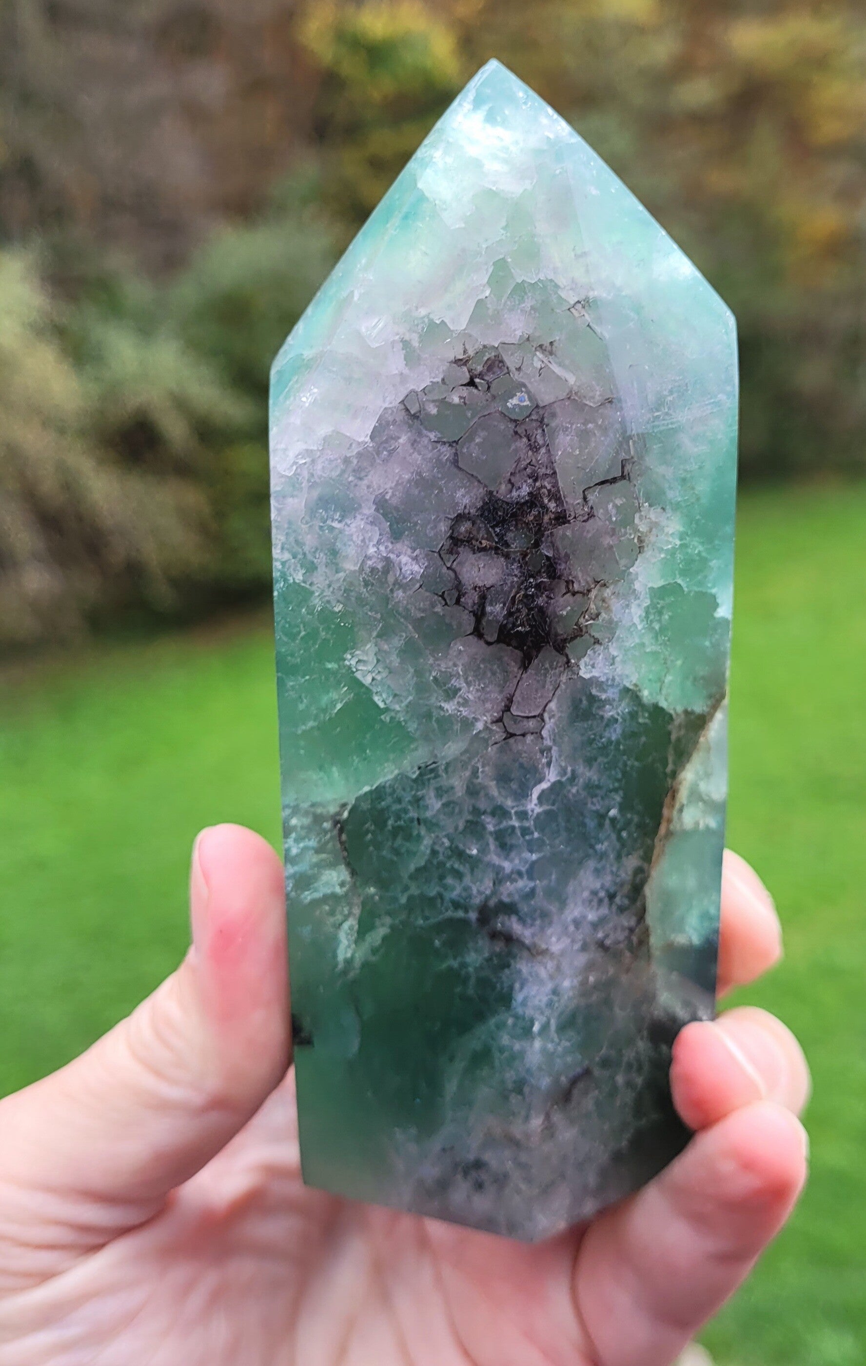 Geslepen toren Groene Fluoriet uit Madagaskar.
