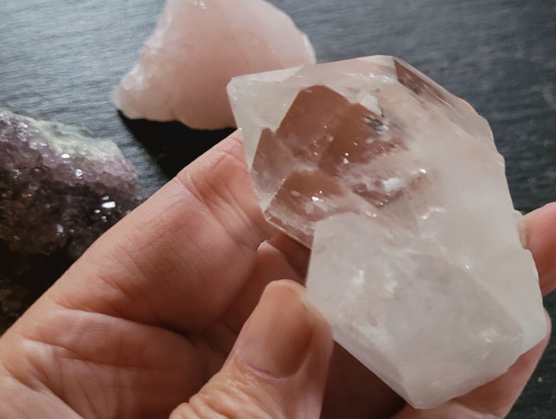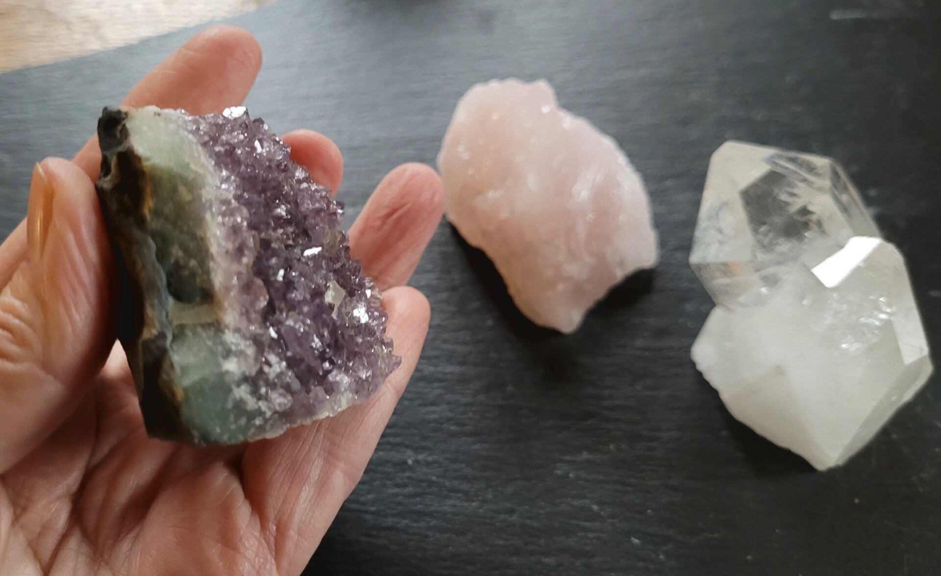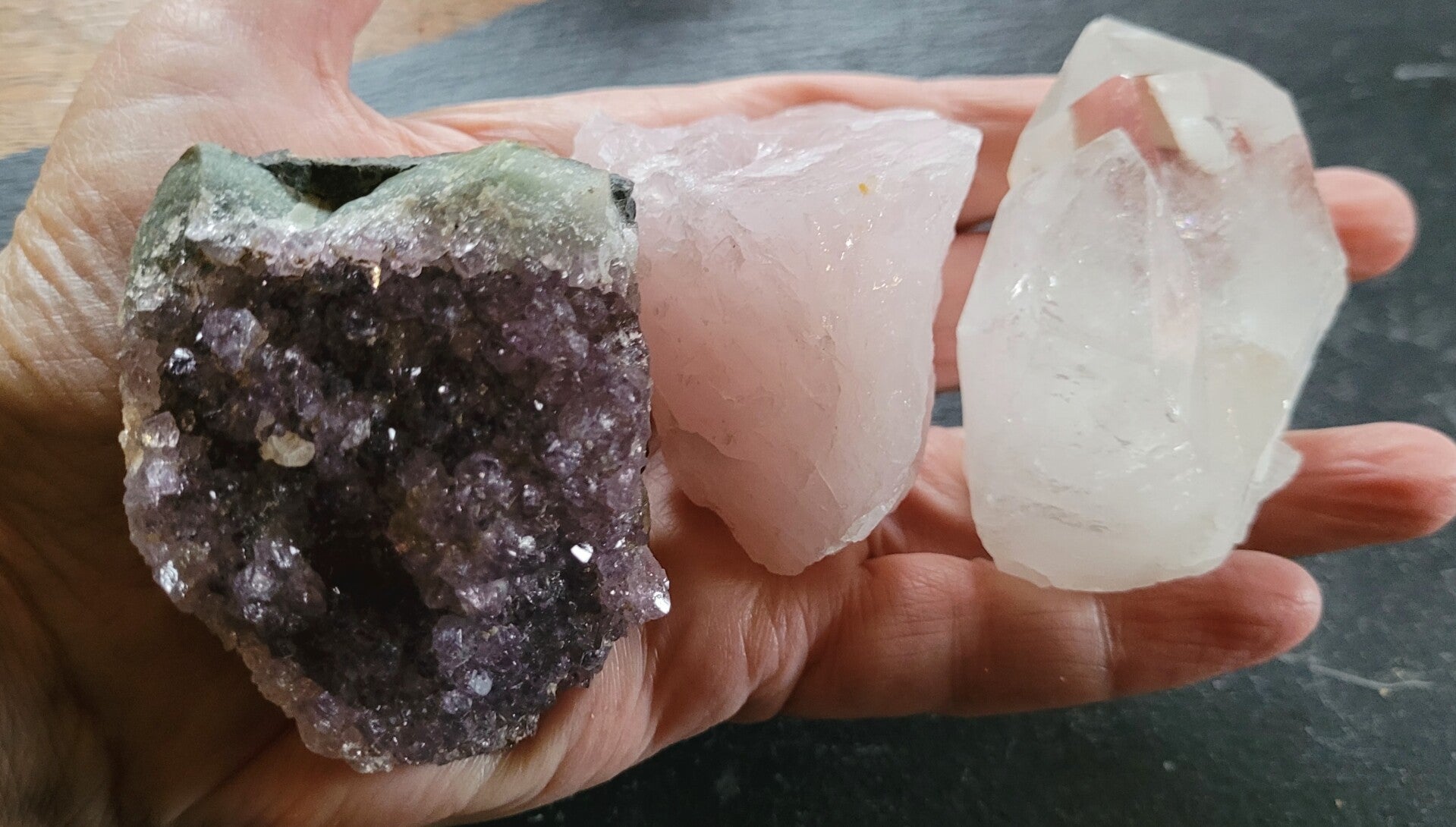 Set von 3 Roh kristalle/ steine. GOldene Dreieck. Bergkristall von Diamantina, Rosenquarz von Madagaskar und Amethyst von Uruguay.