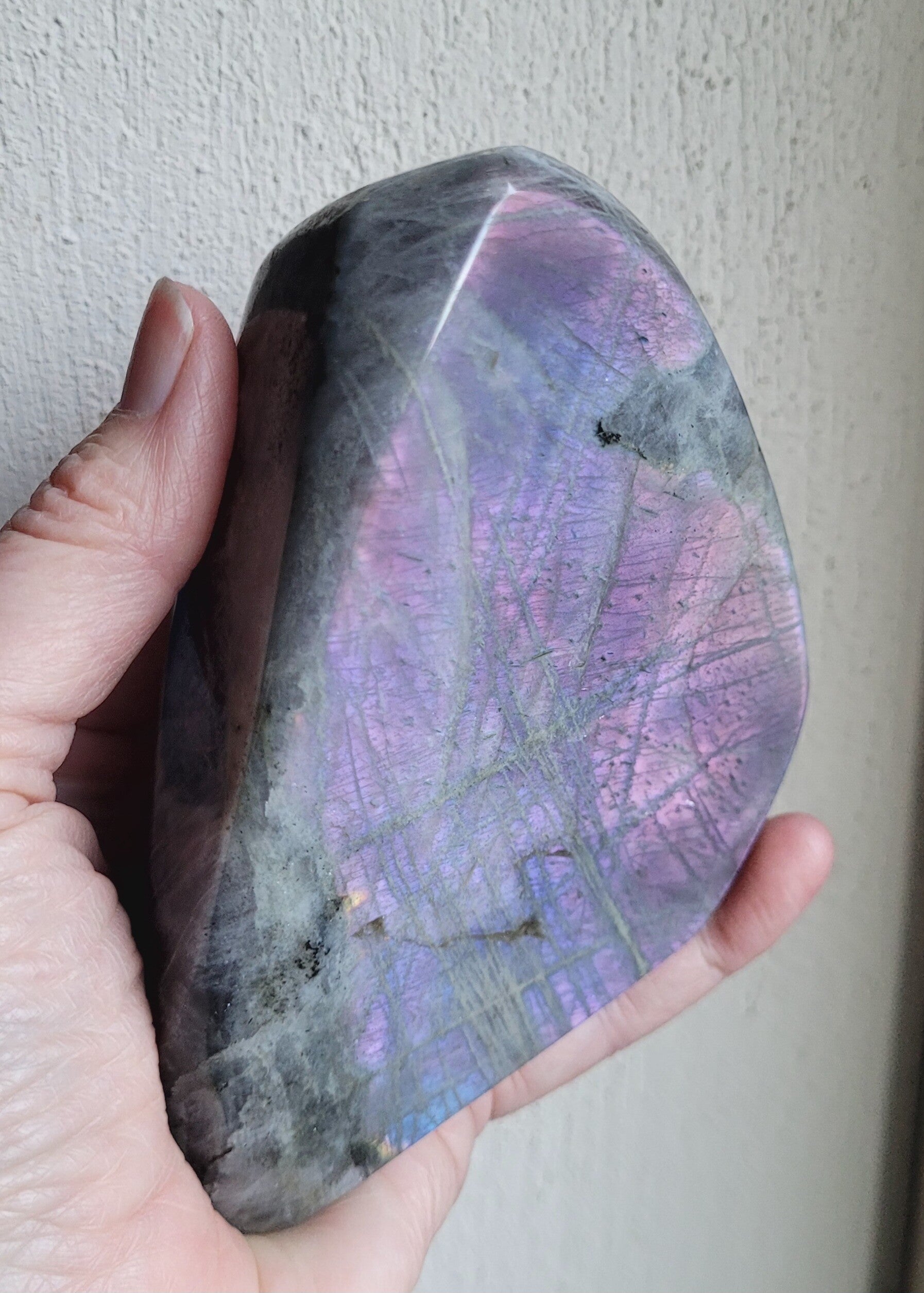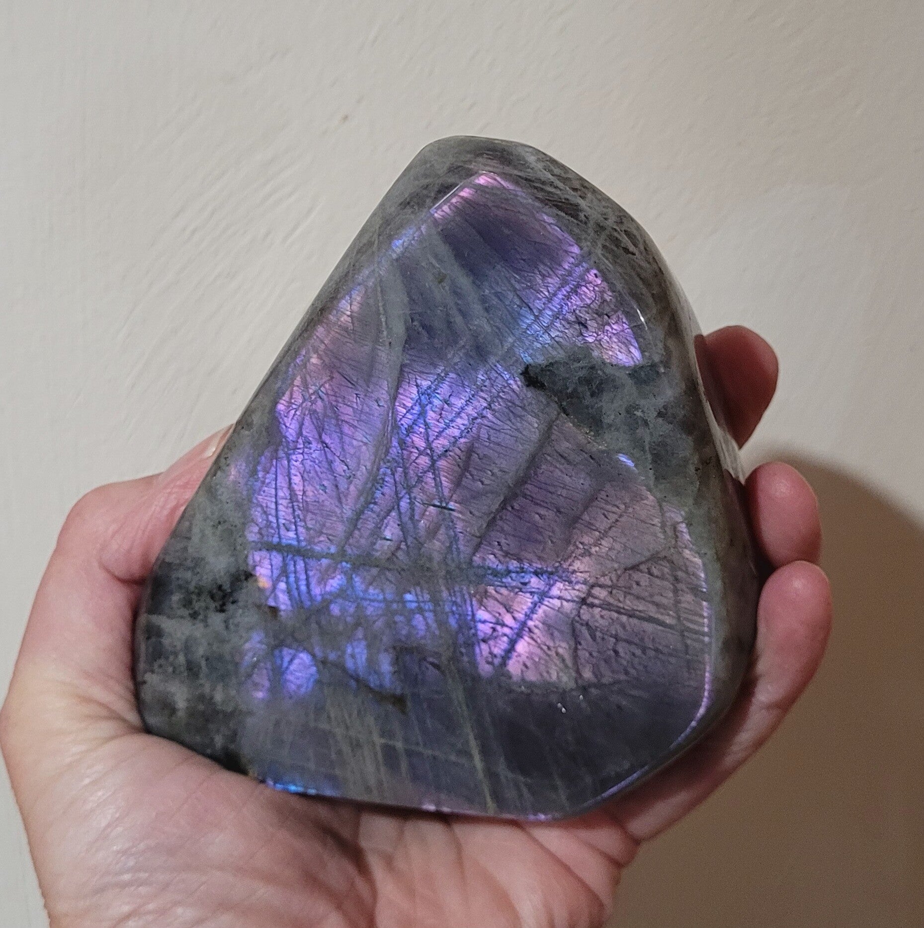 Mooie sculptuur Labradoriet met paarse kleurweergave, het zit erg diep maar toch goed te zien.. ook mermaid Labradoriet genoemd.