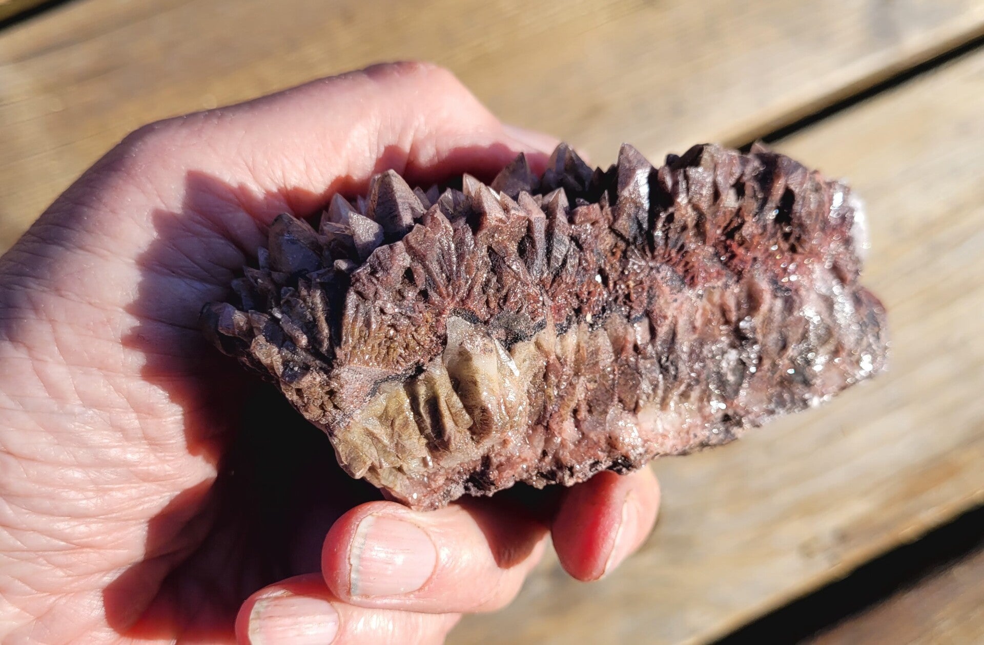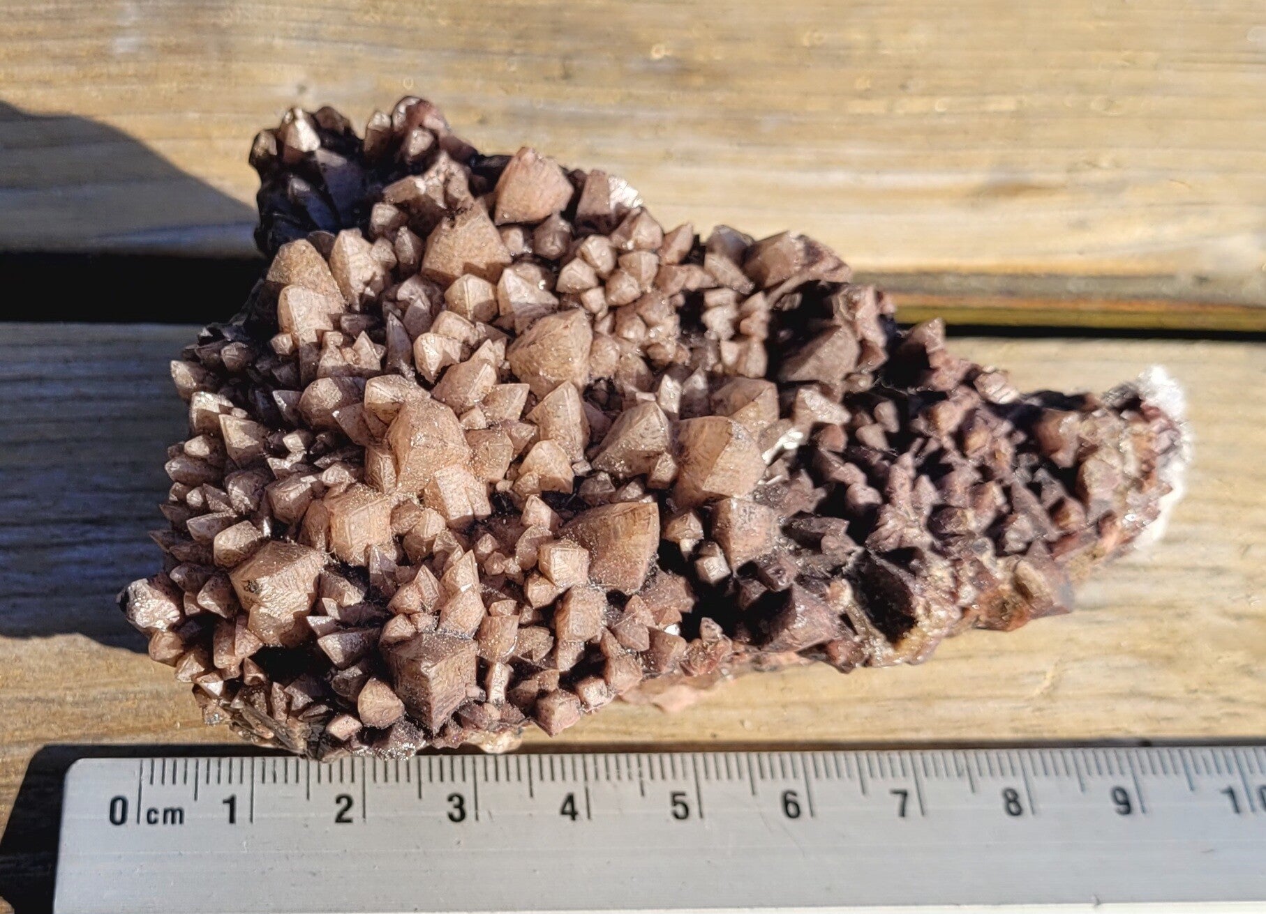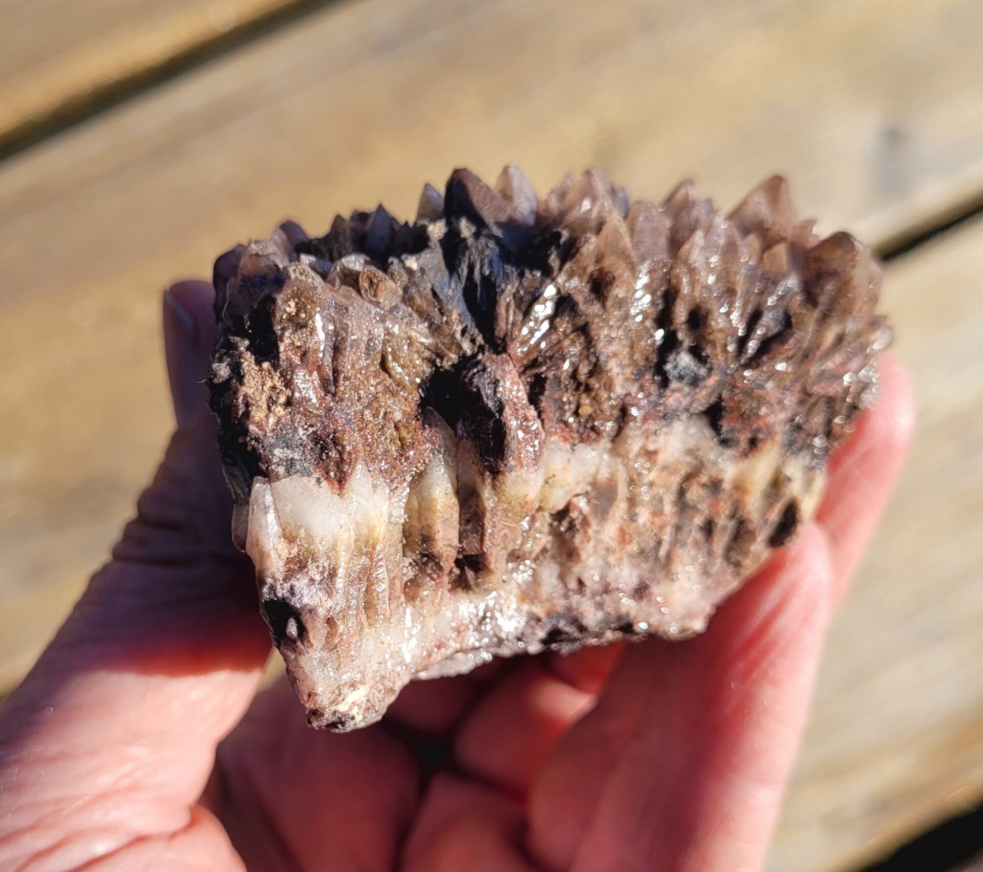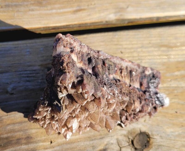 Zelf rechtop staand cluster Dogtooth Calciet uit Mexico. Met witte Aragoniet