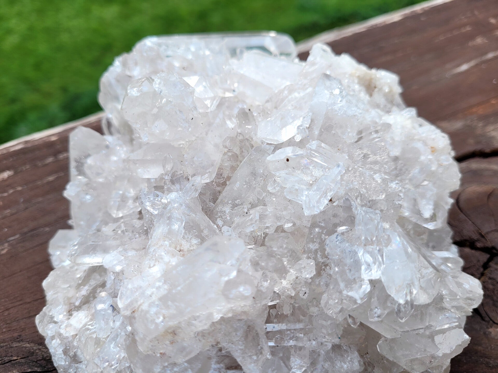 Zwaar cluster Bergkristal met heldere punten alle kanten op, dubbeleindertjes en ook afgebroken punten. Onderkant plat gezaagd.