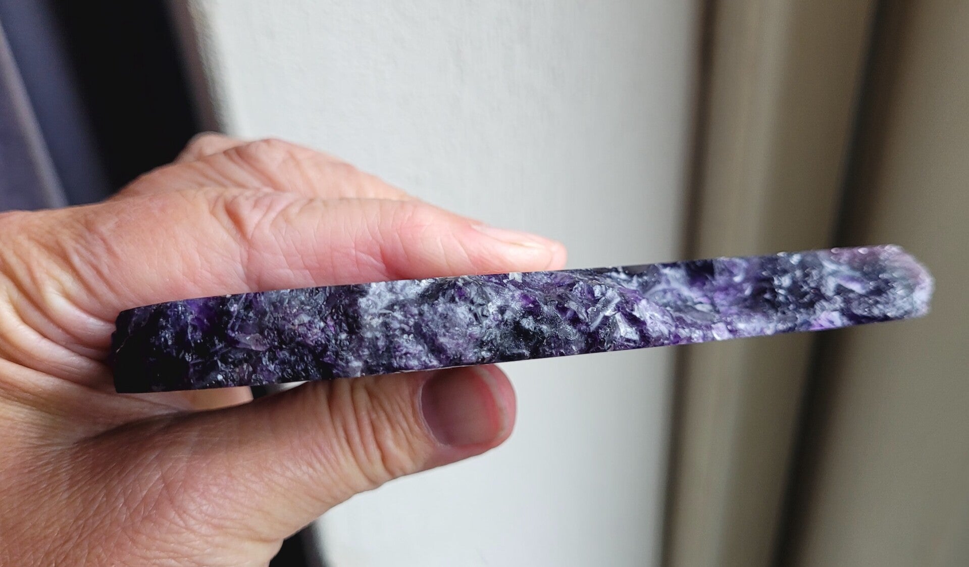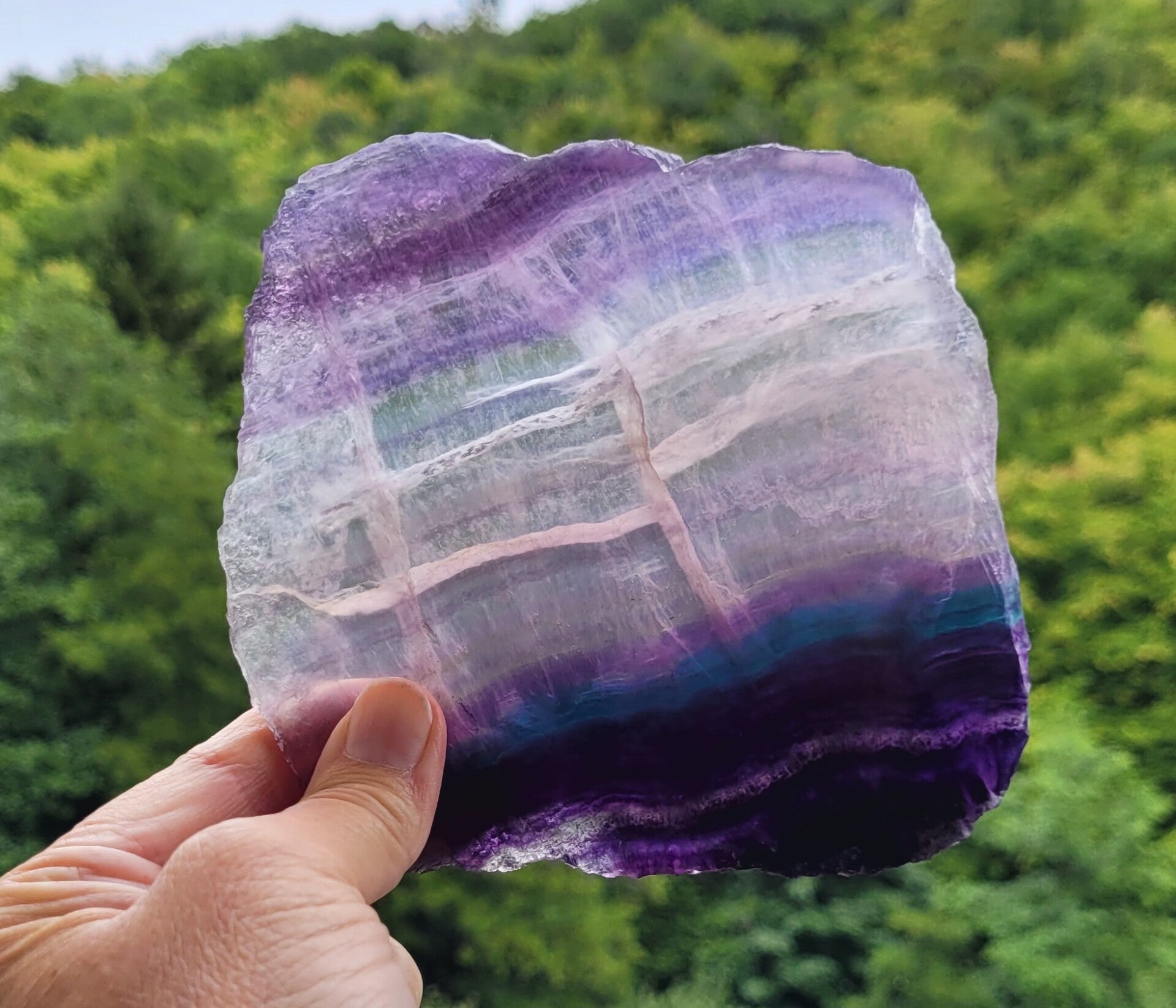 Slab Fluorite, purple transparant en deep blue stripes. With rough sides.