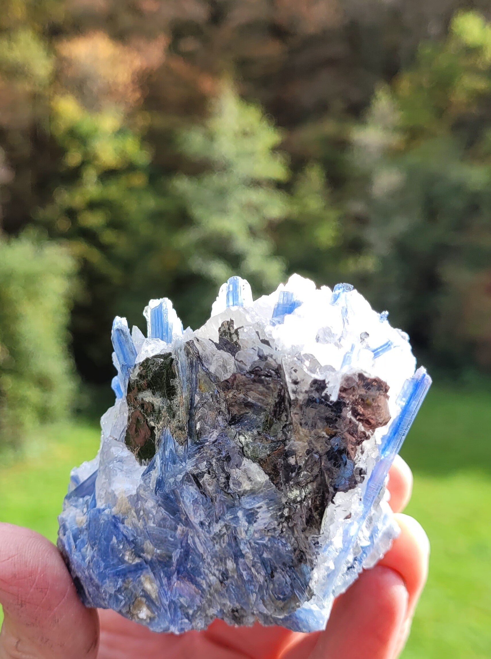 Mooi cluster Bergkristal met veel Blauwe Kyaniet kristallen. Ook deels heldere staafjes. En mica.