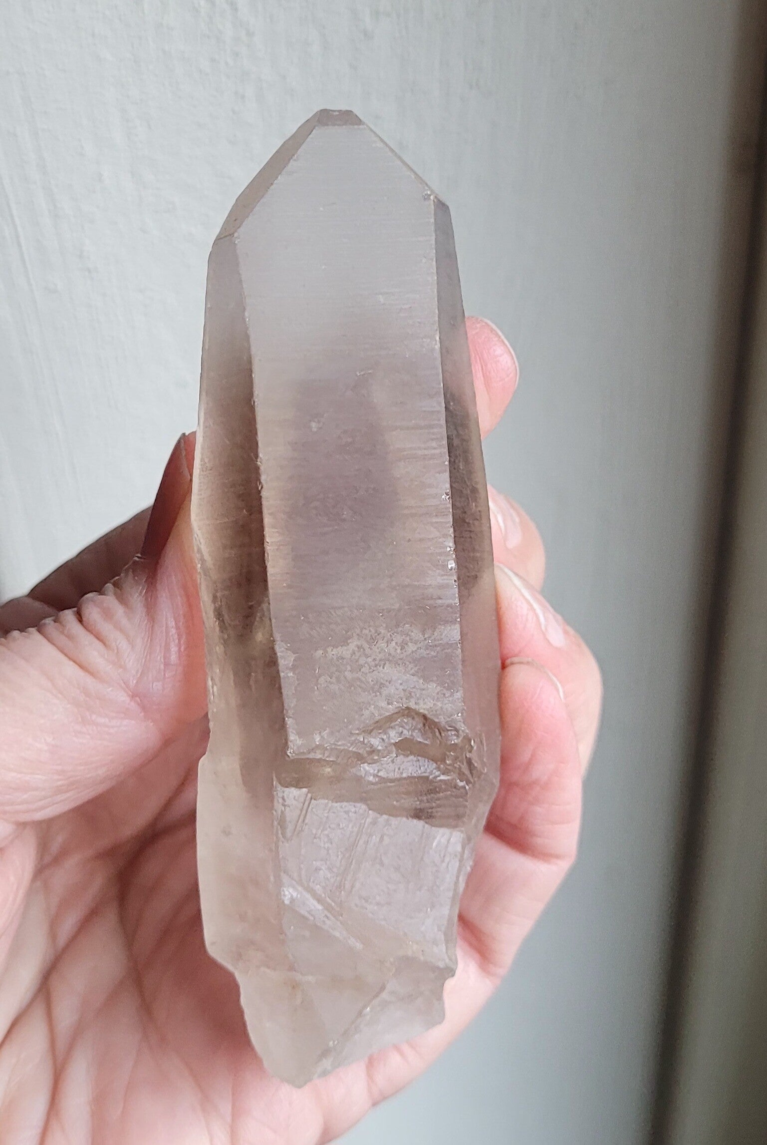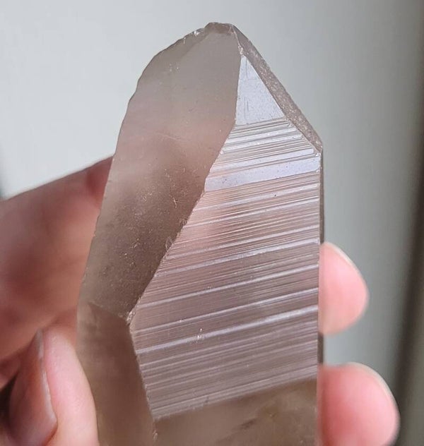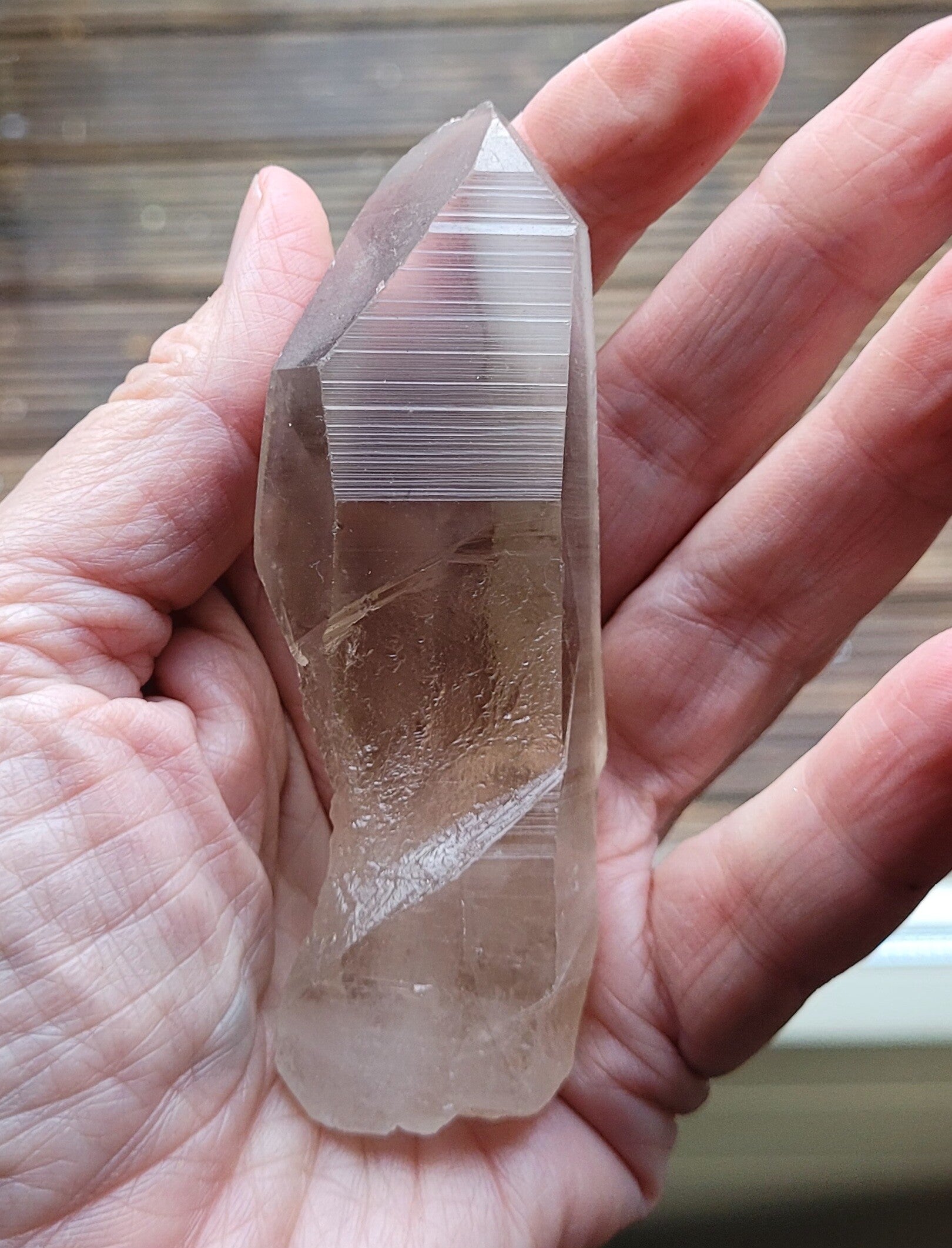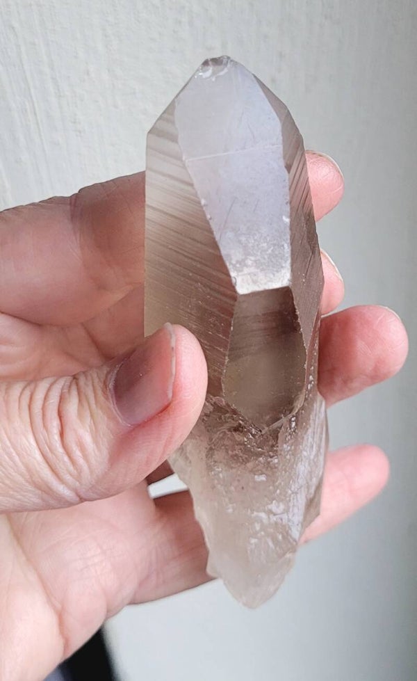 Laserkwarts Rookkwartskristal , zg. Lemurisch kristal door alle 'coderingen' dwarsslijntjes. Niet beschadigd maar is tegen andere kristallen gegroeid. Ondanks dat, minder mooi, dus goedkoper.