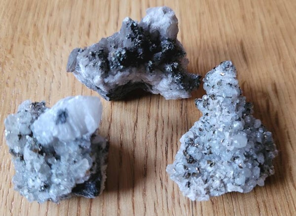 Deze 3 stuks. Mooie kleine clusters (dogtooth) Calciet kristallen met Marcasiet / Chalcopyriet blokjes en schijfjes.