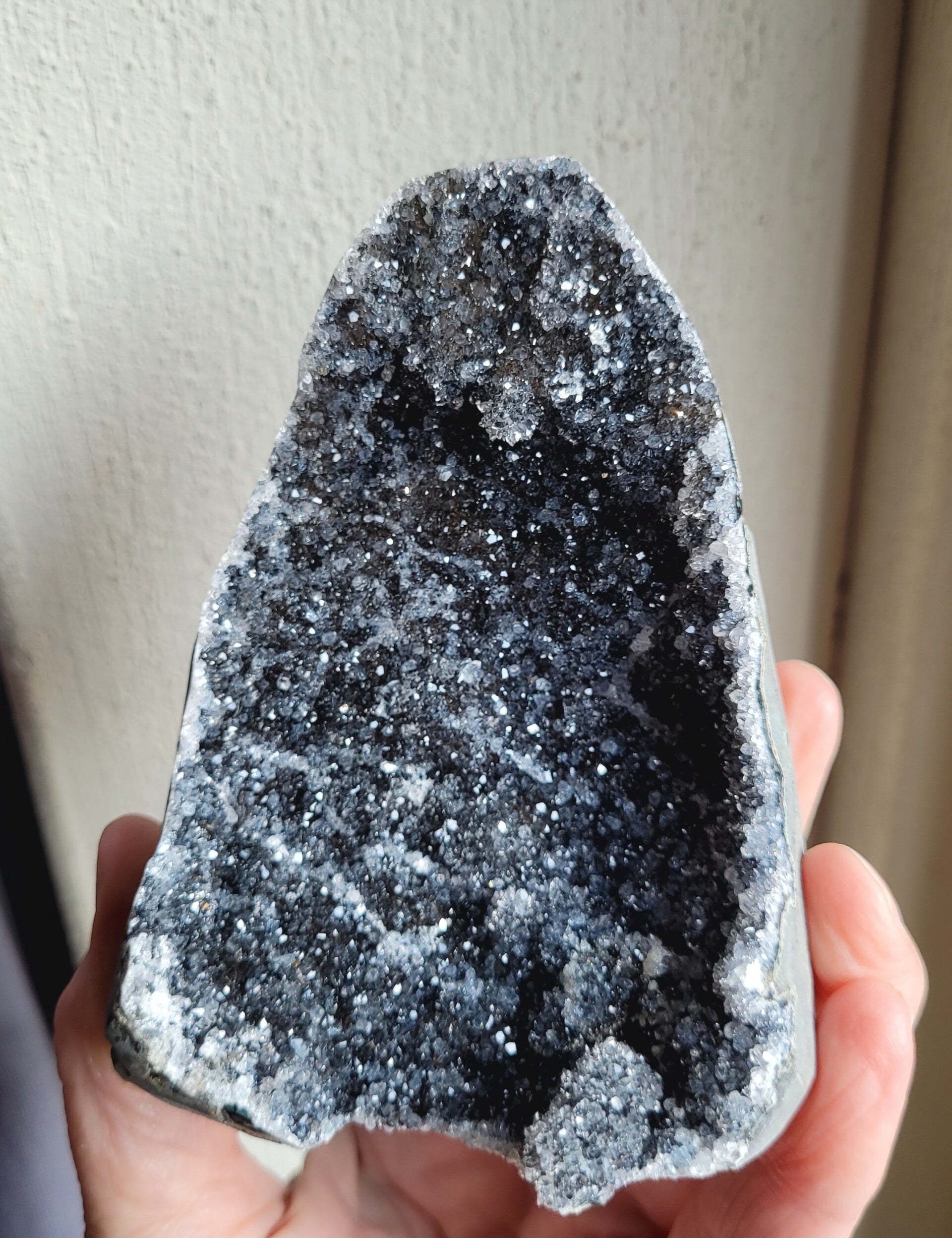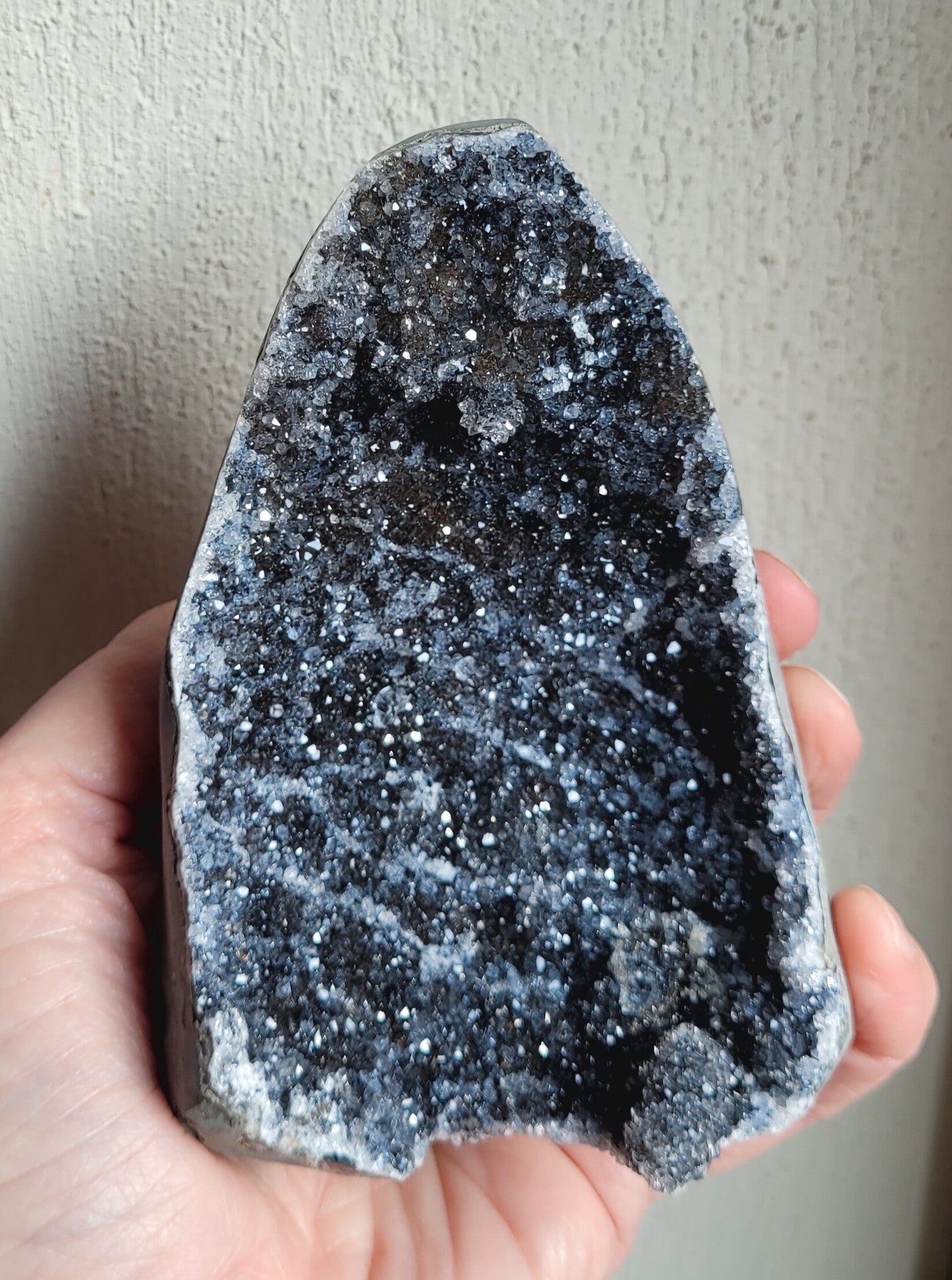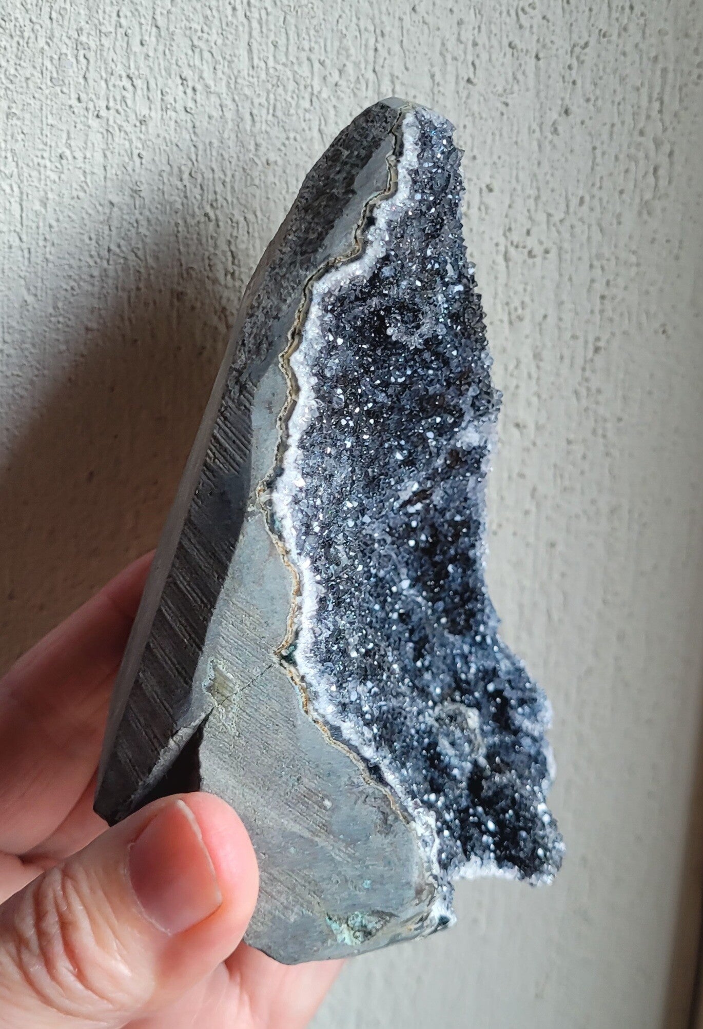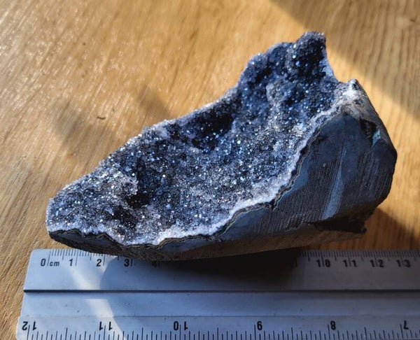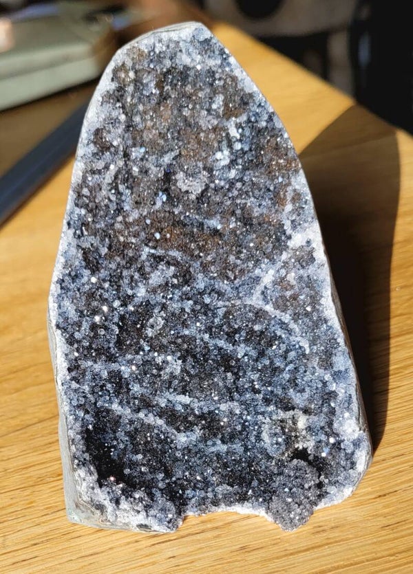 Letterlijk schitterende standup Zwarte Amethist. De donkerste vorm van Amethist. Standup is uitgezaagd uit moedergesteente met gepolijst randje.