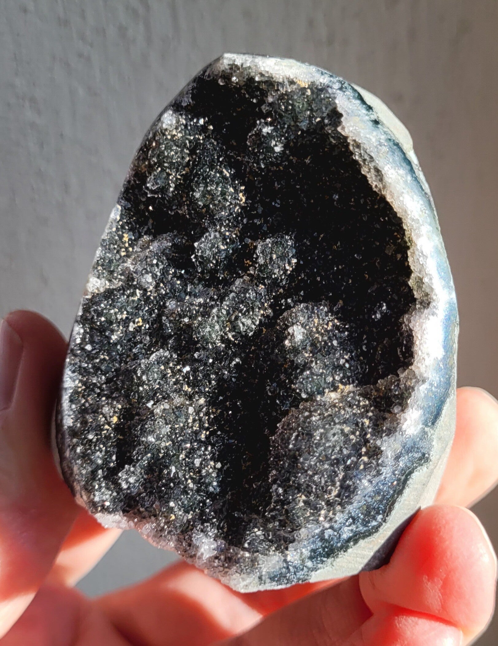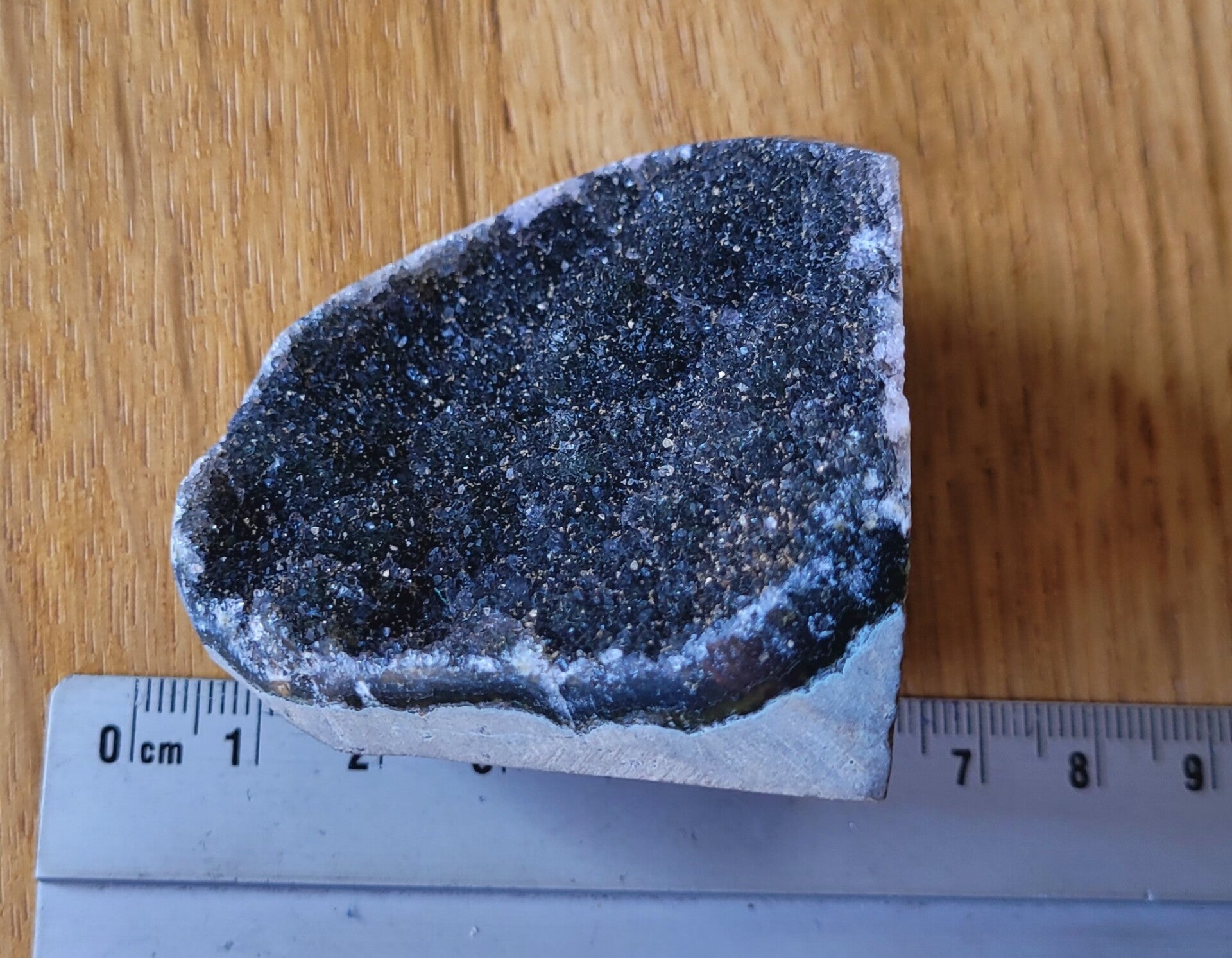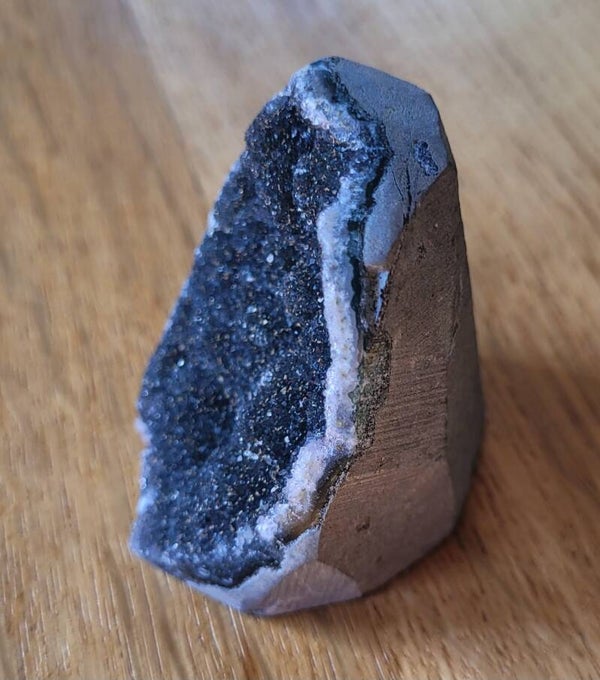 Letterlijk schitterende standup Zwarte Amethist. De donkerste vorm van Amethist. Standup is uitgezaagd uit moedergesteente met gepolijst randje.