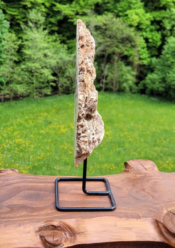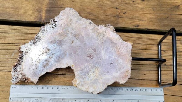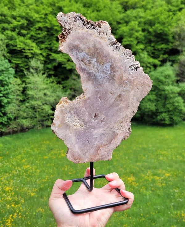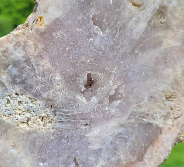 Mooie eenzijdig geslepen roze Amethist met kristalgeode in het midden van het geslepen vlak.