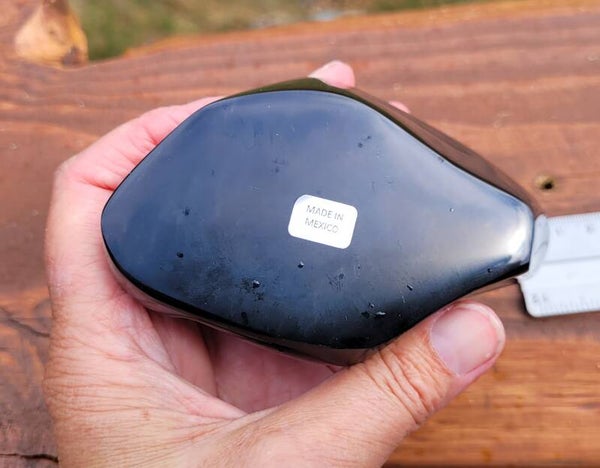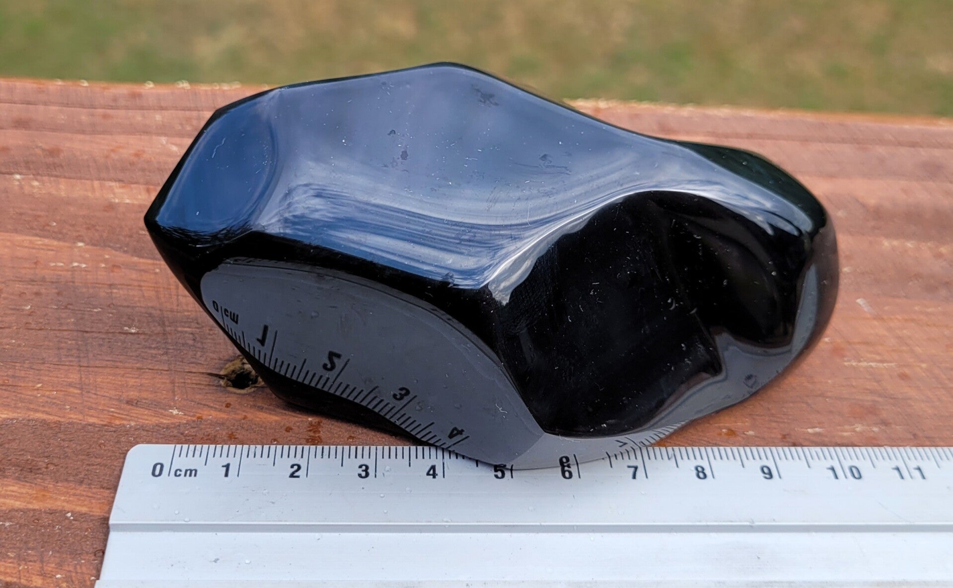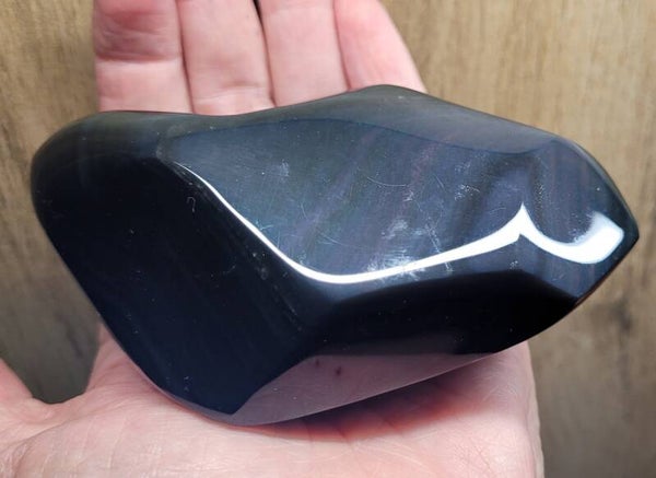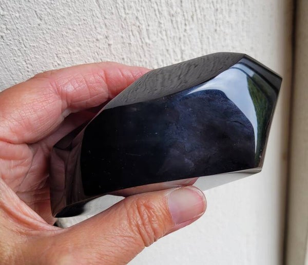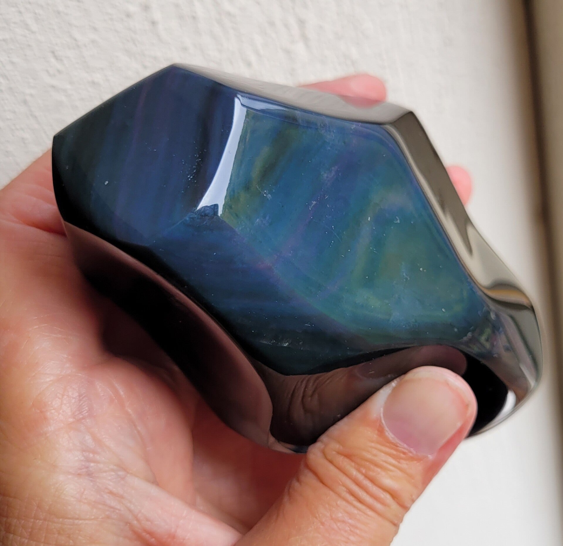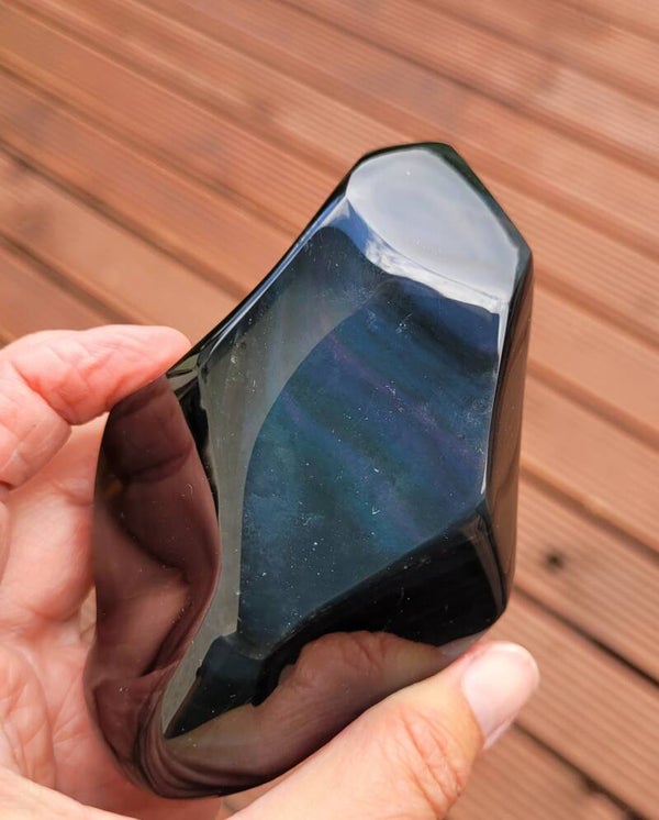 Mooie geslepen sculptuur donker Regenboog Obsidiaan met donkerblauw paars groene kleuren.