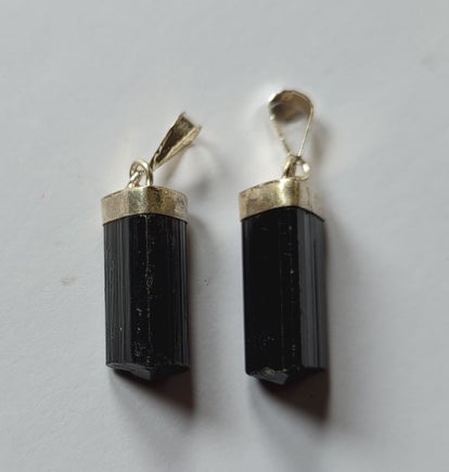 Mooie dikke zwarte toermalijn kristallen met eindkap. In zilver cap hanger.