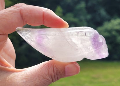Mooie geslepen lange schedel van Amethistkwarts, een zg. Traveller skull.